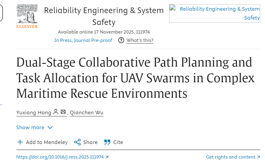 Paper “Dual-Stage Collaborative Path Planning and Task Allocation for UAV Swarms in Complex Maritime Rescue Environments”has been published in Reliability Engineering & System Safety(SCI,ABS-3)。